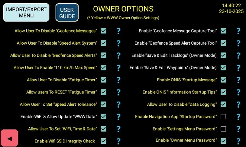 The Outback Navigation Information System (ONIS) has a password (optional) protected Owner Options menu available from the Default Settings menu allowing the owner to tailor various settings for the user.