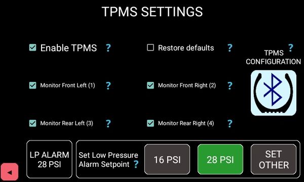The user can use the quick select buttons to set 16 PSI (sand) or 28 PSI (sealed roads) or the "SET OTHER" for any other settings, to set the low pressure alarm.